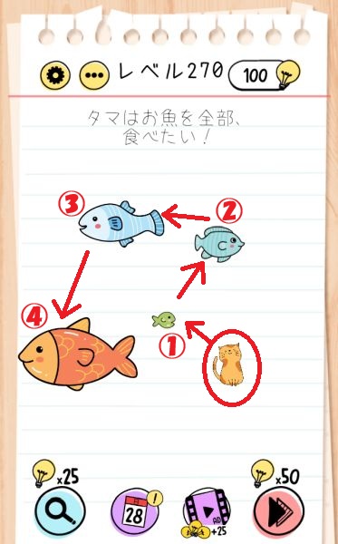 - 中央の緑のお魚→右上の青緑のお魚→左上の青いお魚→左の赤いお魚