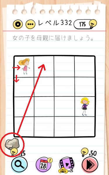 - 左下の石を左上の女の子の右のマスに置く