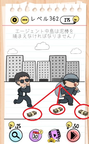 - 落ちているお金を何個か泥棒の袋に入れて重くする
