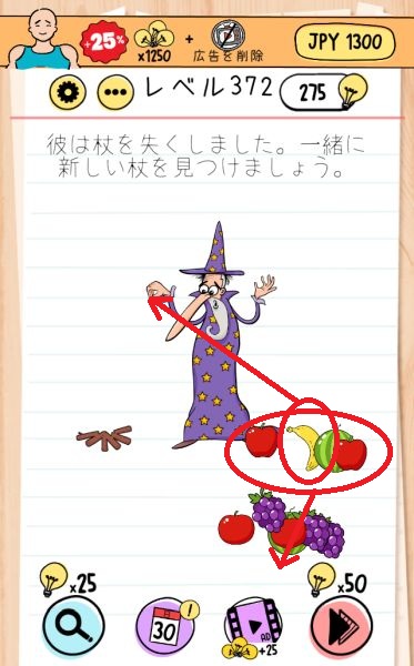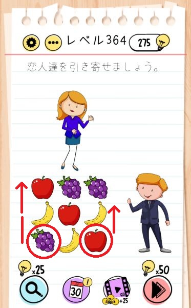 - 右下のリンゴを上にスワイプしてバナナとリンゴを揃えて消す