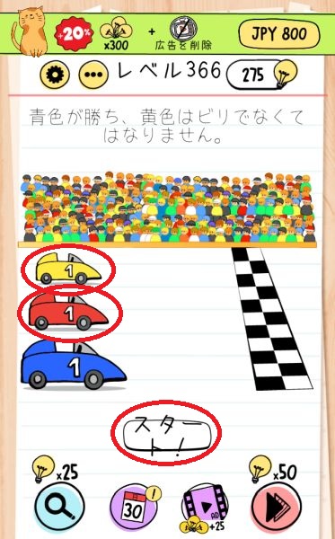- 黄色の車を長押しして止め、赤い車がゴールしたら指を離す