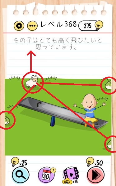 - 羊をシーソーの左の上のあたりに動かして落とす