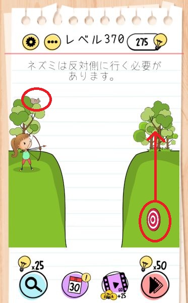 - 左上の木にいるネズミを3回タップして弓の上に落とす