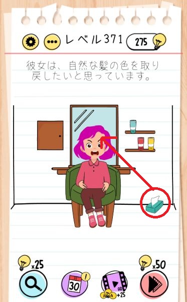 - 右のティッシュをタップして取り出し、3回髪の毛に使って色を落とす