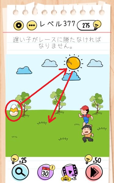- 左にある卵(チョコエッグ)を右上の太陽のところに動かして溶かす