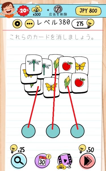 (下の〇のところに同じ絵柄のパネルを3枚動かして消す) - リンゴ・とうもろこし・トンボ・蝶々のそれぞれ4つの絵柄を3つ見つけて全て消せばクリア