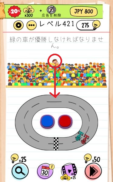 - 上の観客席の中央あたりにいる男の子をコースの上に動かして赤い車を止める