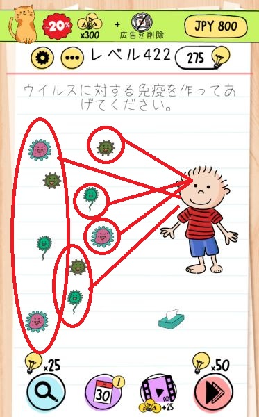 - ピンク・トゲトゲ・尻尾つきの3種のウィルスをそれぞれ男の子に渡す