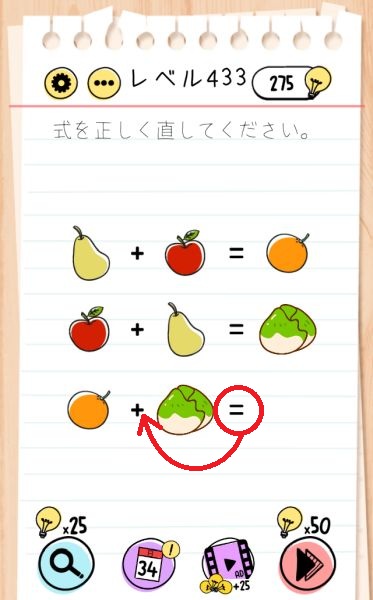 - 右下のキャベツの右の=を左(オレンジとキャベツの間にある+のところ)に動かす