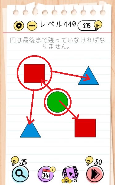 - 次に緑の丸を2つの赤い四角のところに動かして消す