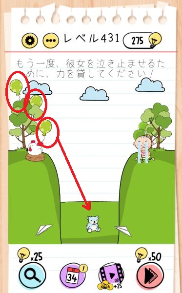 - 左上の緑の風船を3つ下のクマのぬいぐるみにつける