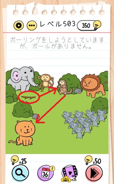 - 丸くなったアルマジロを左下の猫ちゃんに渡す