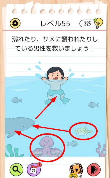 - 右下の黄色いフグをサメのところに動かして膨らませる