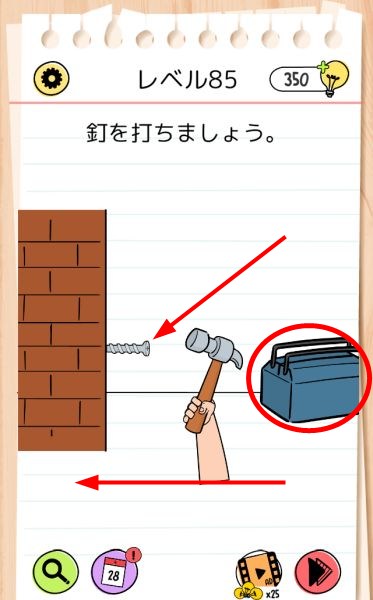 - 右にある工具箱を3回タップして工具を出し、出てきた黄色いドリルをネジに使う