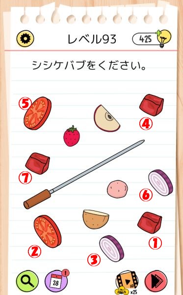 - 串にお肉(四角いもの)・トマト・玉ねぎの順(以下の順番)に刺す
