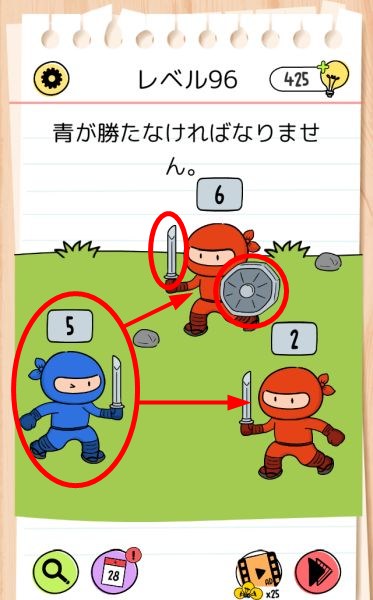 - 青い忍者を右下の赤の忍者にぶつけて戦わせる