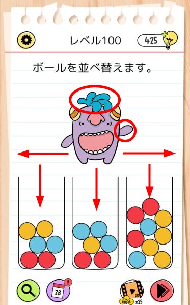 - 上のモンスターを下の3つの入れ物にそれぞれ下にスワイプして青いボールを食べさせる